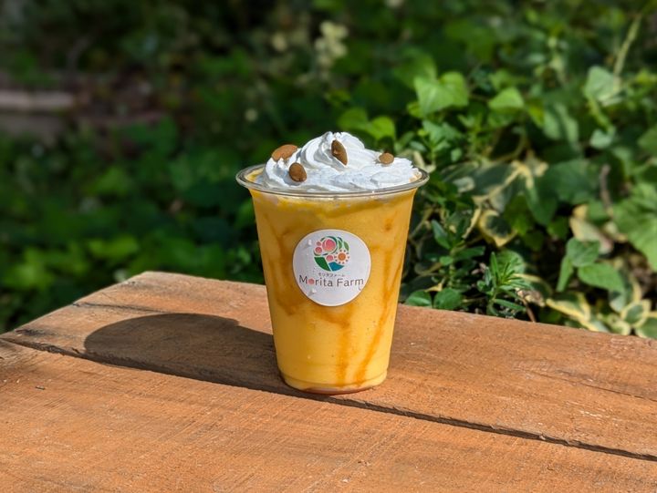 モリタファームが育てた桃と、農家から直接仕入れた山梨県産の果物をスムージーに。素材そのままのおいしさが楽しめます。今月のおすすめは「かぼちゃとりんごのハロウィンスムージー」とのこと。