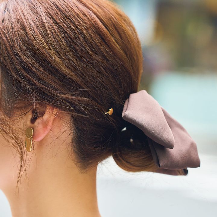 顔周りだけ36㎜のコテでリバースに巻いてストンと落とす韓国風ヘアでエレガントに(サナヨさん)。大きなリボンがくっついたヘアアクセは、パパッと束ねただけでも手をかけたまとめ髪に見えます(サエカさん)。