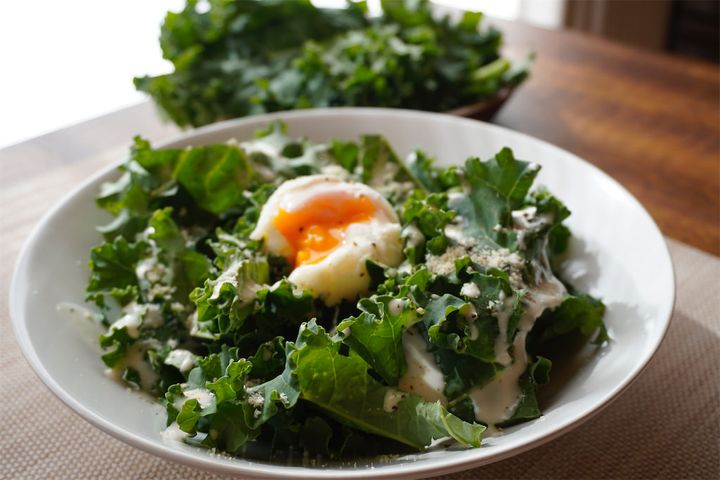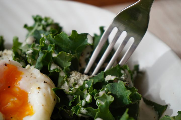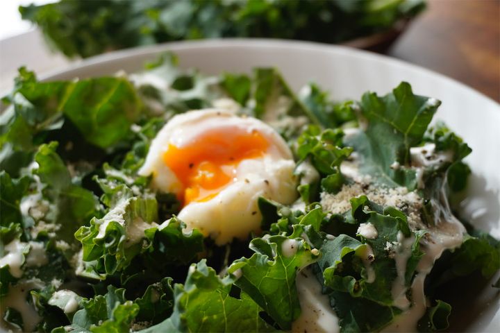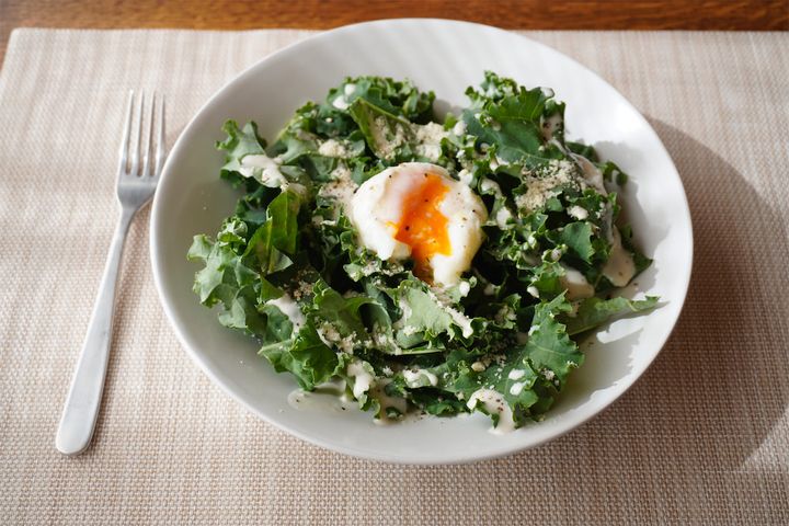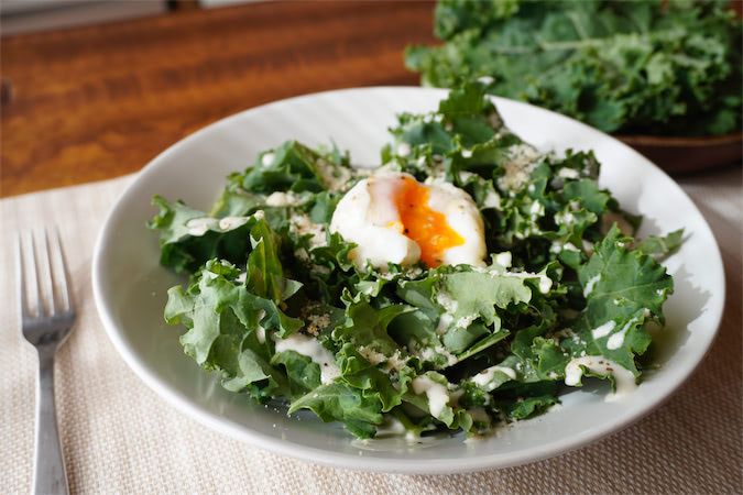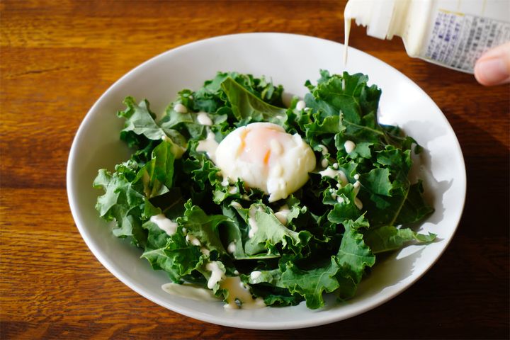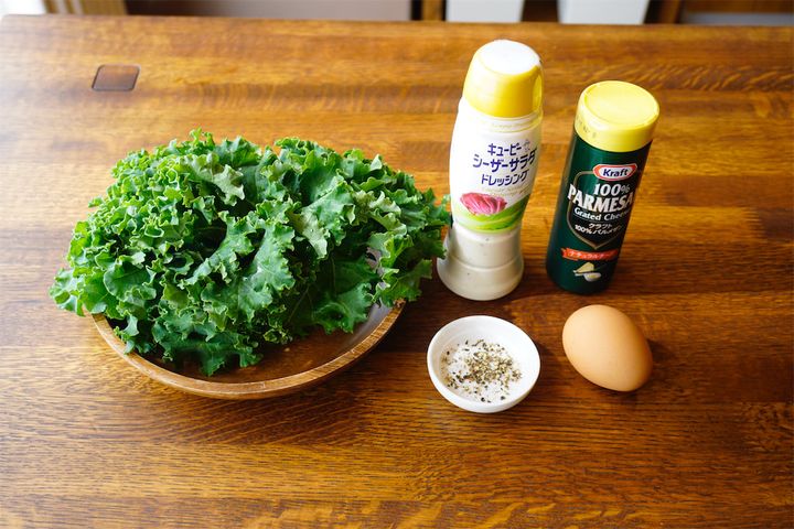 シーザーサラダのドレッシングって風味が強いので、野菜の味が消えちゃいがちなんですけど、ケールは全然負けないんです!トッピングの温玉とパルメザンチーズを絡めれば、止まらなくなるおいしさ。