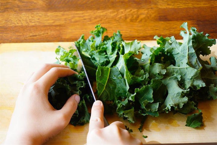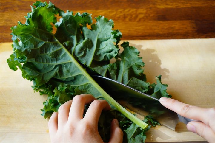 1.ケールの葉をよく洗い、中心の茎を取り除いてから、ざく切りにする。
