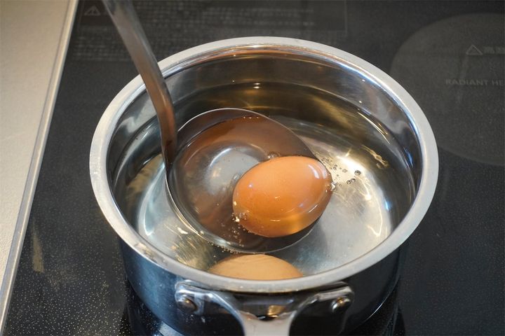 2.鍋に水を入れて沸騰させたら、鍋を火からおろす。冷蔵庫から出した卵を入れ、フタをしてそのまま10分置いたら、卵を氷水に移して完全に冷ます。