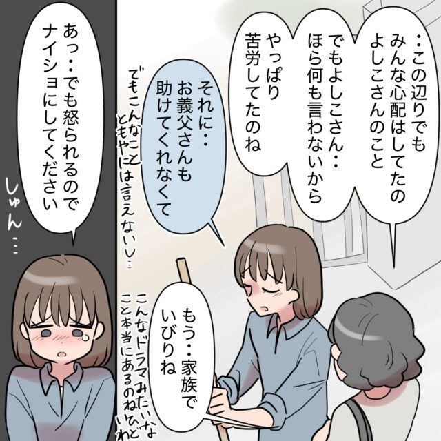 「もう・・・家族でいびりね」と言う近所の人によると、実はよしこさんのことを近隣の住人は心配しているのだということがわかりました。