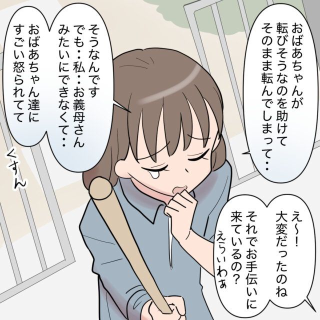 よしこさんが骨折したと聞いて驚くご近所さんに、ゆかりさんは「おばあちゃんが転びそうなのを助けてそのまま転んでしまって」と、義祖母のために骨折したことを伝えながら、更にお手伝いに来てはいるものの、よしこさんのようにできないために義祖母たちに怒られていることも涙ながらに語りました。