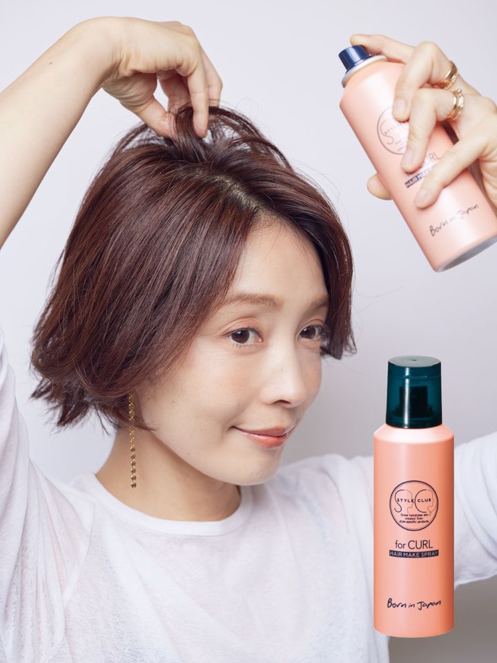 全体をラフに乾かしたら、手でもみ込むようにバームやワックスをつけて毛先のハネ感をメイク。顔まわりはリバースに流し、最後にスプレーで動きをホールド。スタイルクラブ フォーカール ヘアメイクスプレー 110g ¥1,650/アリミノ(TEL 0120-945-334)