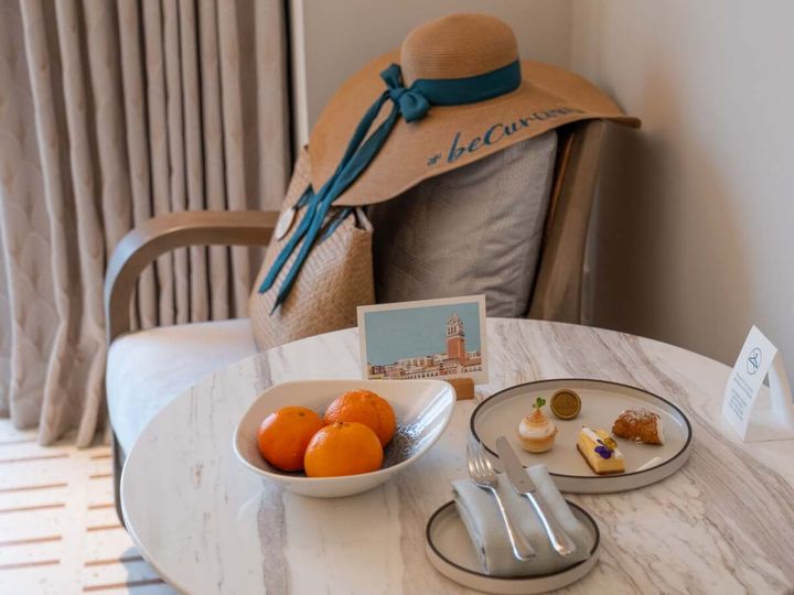チェアには帽子とバッグが用意されていて、ビーチやプールに出かける際に使用することができます。テーブルにはフルーツとスイーツも。ウェルカムされてるなーって感じですね。
