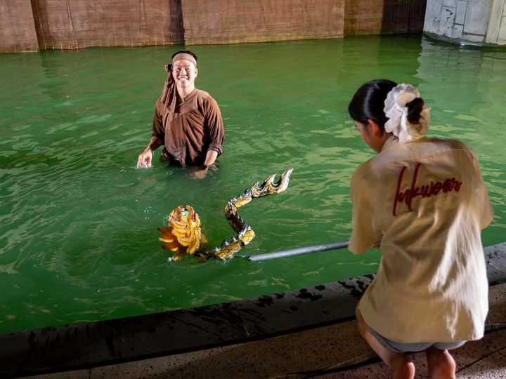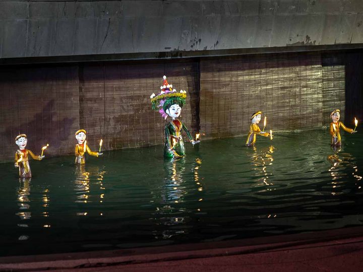 ベトナムで一度は見てみたいのが水上人形劇。A Oiシアターで鑑賞することができます。今回鑑賞してわかりました。長い棒の先につけた人形を、すだれの後ろから操るんです。