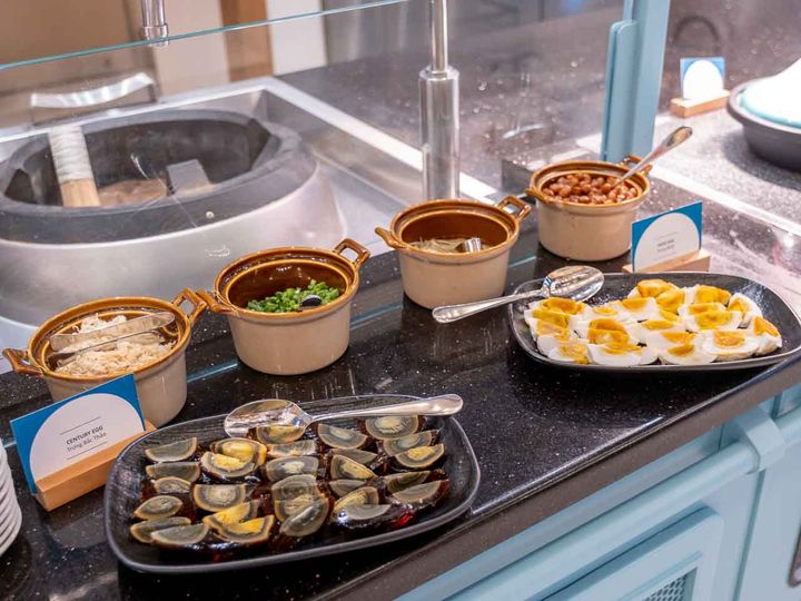 こちらはベトナムでよく朝食にいただくという中華粥のスタンド。塩たまご、ピータンや野菜をトッピングしていただきます。