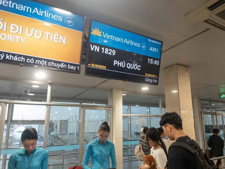 成田から約7時間、ホーチミンのタンソニャット国際空港に到着して、国内線のターミナルへ移動します。すぐそばに並んで建っているのでスーツケースを転がしながら歩いて5分。成田から通しでチェックインしているので、プーケットへのチケットもすでに入手済み。荷物を預けて搭乗です。