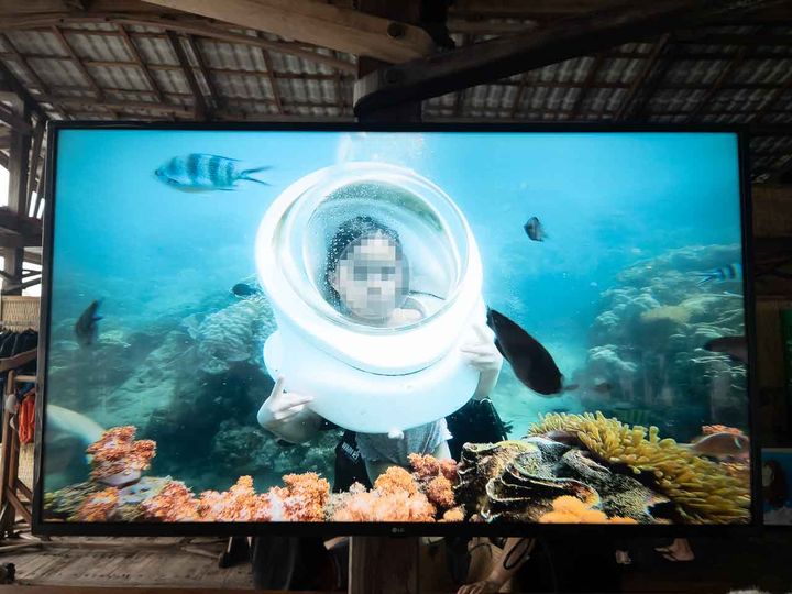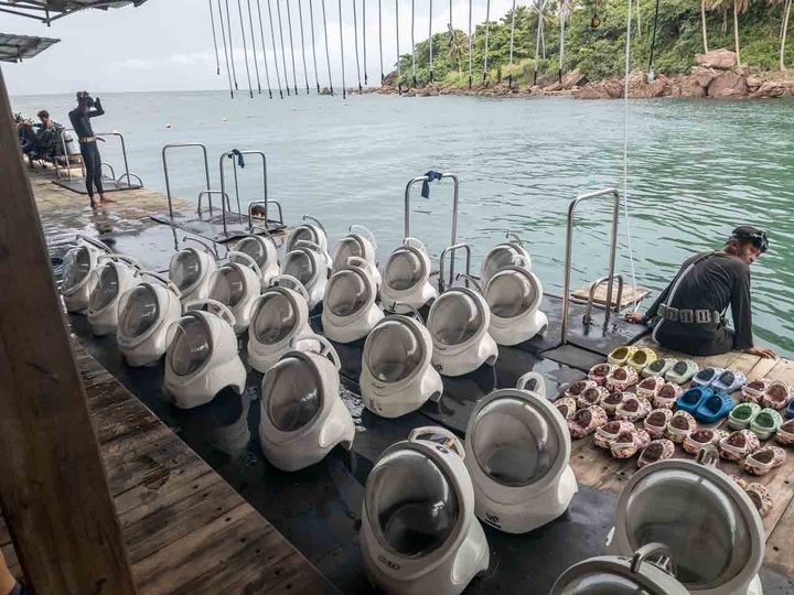 島内の「Eco Beach Club」ではSea Walkも楽しめます。ずらりと並んだのが頭にかぶる水中用のヘルメット。ここにチューブで酸素が送り込まれます。