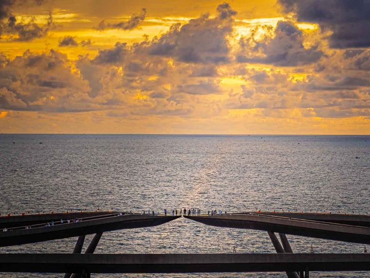 上の写真はサンセットタウンの目玉の一つ、「Kiss Bridge(キスブリッジ)」をホテルの部屋から眺めました。写真中央の橋と、下にある橋の2本がありますが、上の方は途中で切れているんですね。両側から歩いてきて、ここで出会ってキスをして愛を確かめるというアクティビティです。