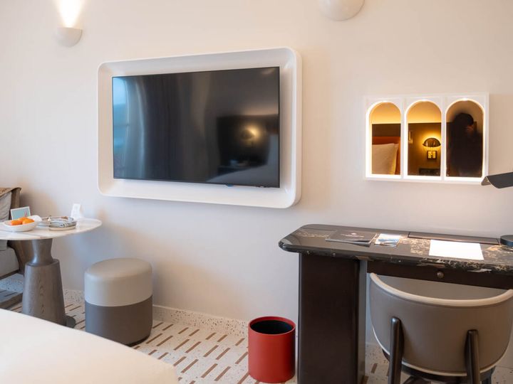 ホテルの部屋にあるテレビって無機質なものが多いのですが、こちらは白い枠に収まってスタイリッシュ。インテリアはイタリアン・モダンなシェイプとカラーで統一されています。