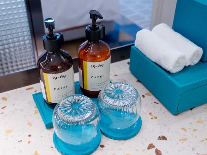 ハンド&ボディーソープ、ハンド&ボディローション、そして、シャワーブース内のシャンプー、コンディショナーも、スウェーデン人アーティストのヨハン・ベルゲンが手掛ける、パリ発のカルチャー・コスメティックブランド19-69(ナインティーンシックスティナイン)のもの。