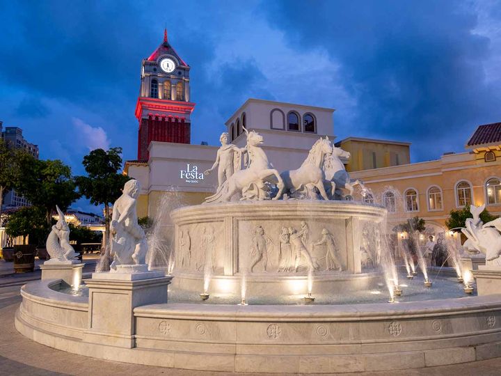 こちらがサンセットタウンにある「La Festa Phu Quoc, Curio Collection by Hilton」のエントランスのすぐ横にある「泉」です。イタリアの広場にある泉のように神々しい! 夜空に突き出た時計塔もゴージャスです。