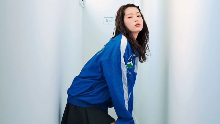 ブルーナイロンジャケット 2,420円/原宿シカゴ神宮前店 グレーフレアーミニスカート 9,790円/REDYAZEL(REDYAZEL ルミネエスト新宿店) ブラックリボンヘアクリップ 550円、ブラックソックス 770円/ともにWEGO ブラック×ホワイトスニーカー 9,900円/FILA