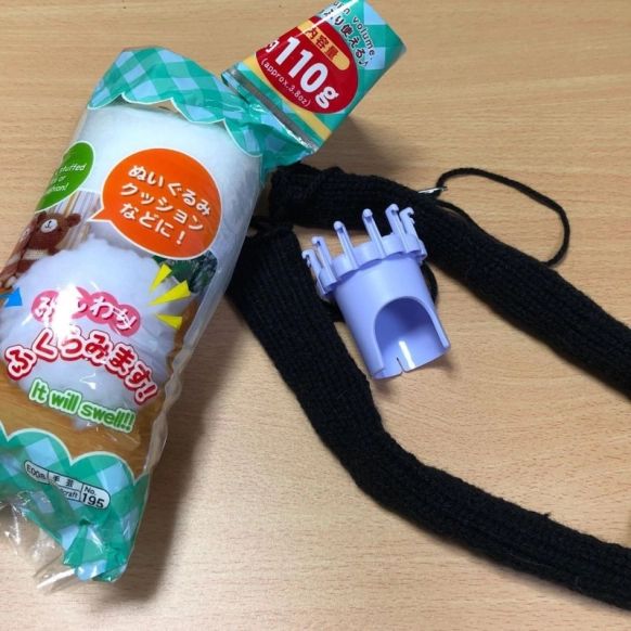 1.「毛糸deリリアン」を使って毛糸を編み、ワタを詰めリースの土台を作ります。