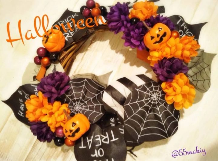 まずは100均の商品で作れるハロウィンリースのご紹介です。 このリースを作ったのは@madamazami1919さんです。作り方をまとめてみました。