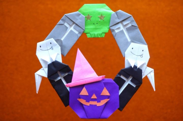 カボチャやオバケやリボンの折り方は、検索するとたくさん出てきます。折り紙で折ったものを丸状につなげてリースに見立てても良さそう◎
