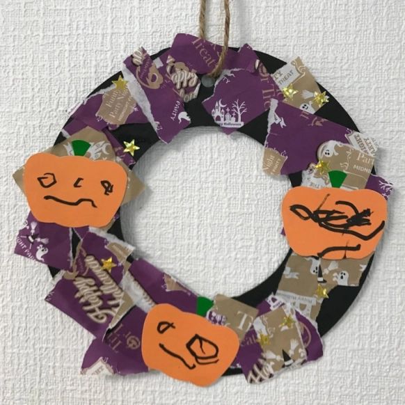 最後は折り紙で作るハロウィンリースです。 このリースは@daoxieliaoziさんが2歳のお子さんと作ったものです。