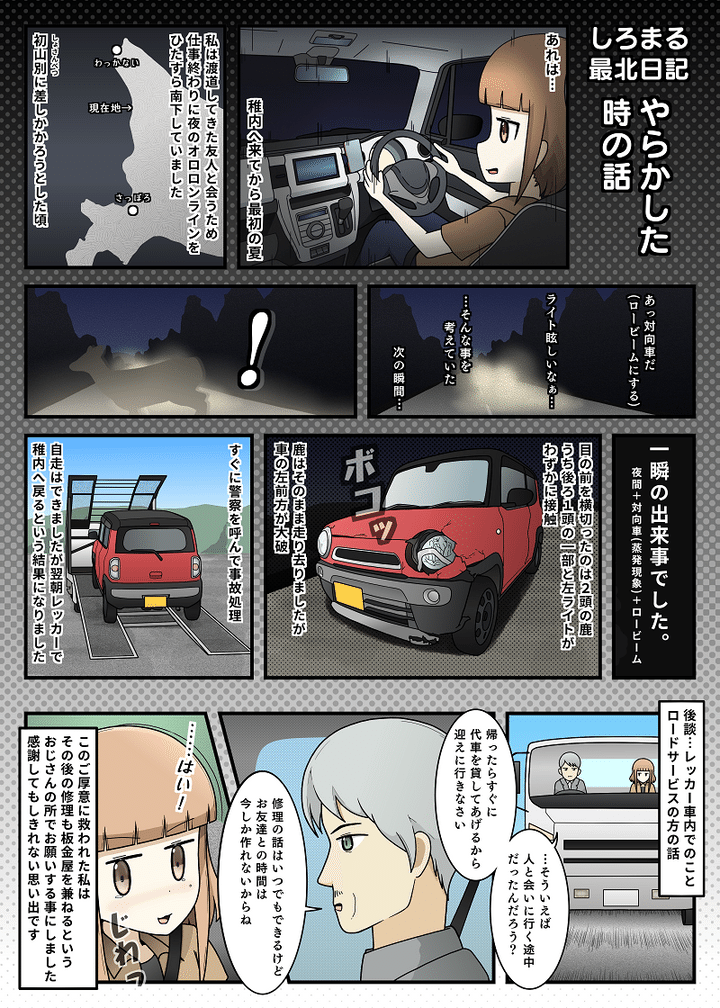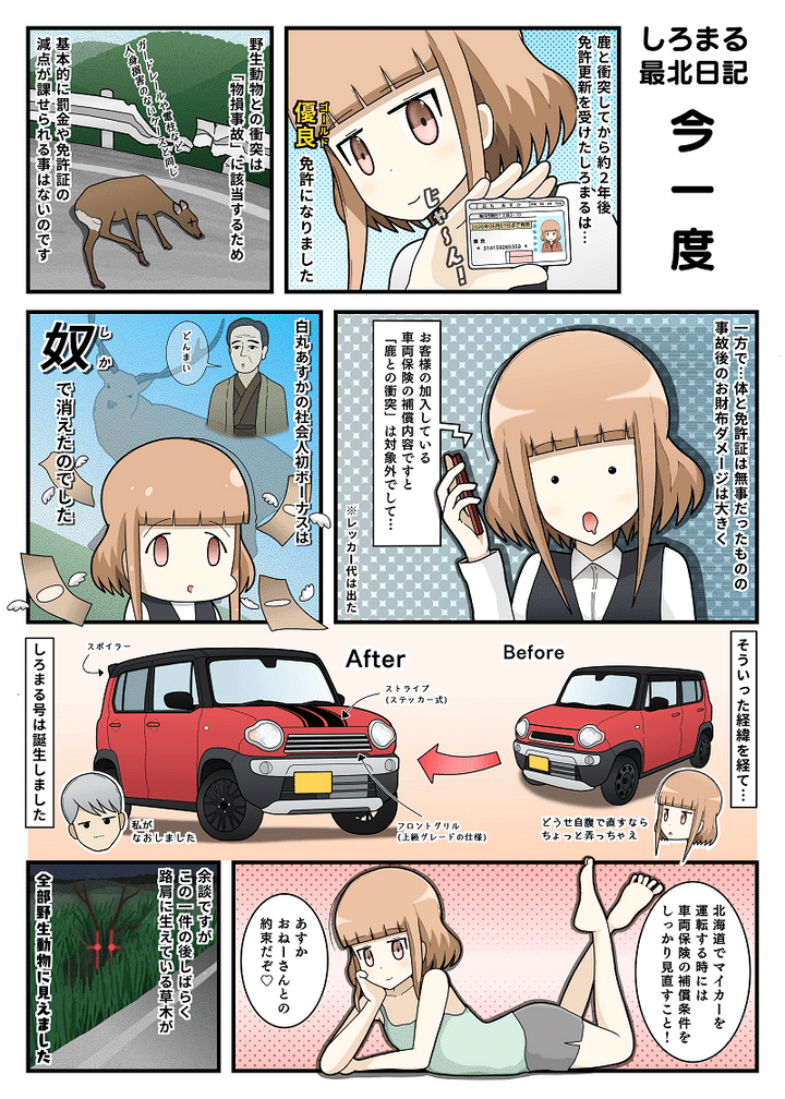 「鹿との衝突」で初ボーナスがぶっ飛んだ…”北海道あるある”な交通ハプニングにご注意を|しろまる最北日記vol,33【漫画】