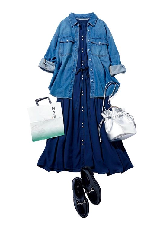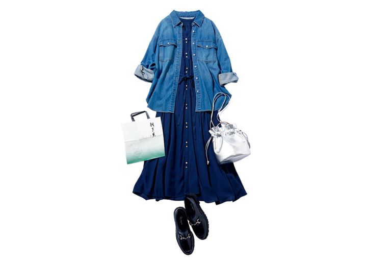 デニムシャツ¥18,700/アルページュストーリー ネイビーワンピース¥22,000/マイストラーダ ローファー¥33,000/銀座かねまつ(銀座かねまつ6丁目本店) シルバーバッグ¥3,628/grove(ワールド)