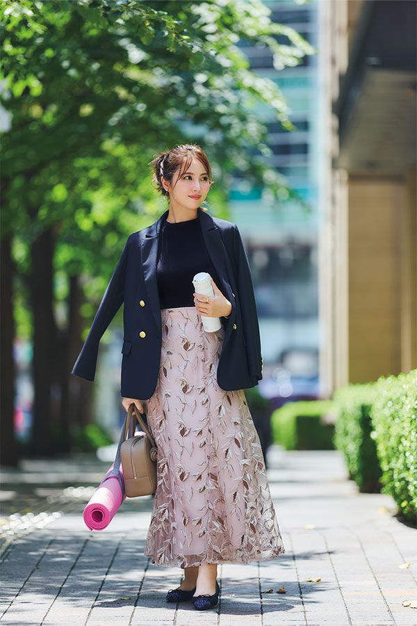 ピンクの華やかスカートはネイビージャケットを合わせて糖度オフ♡