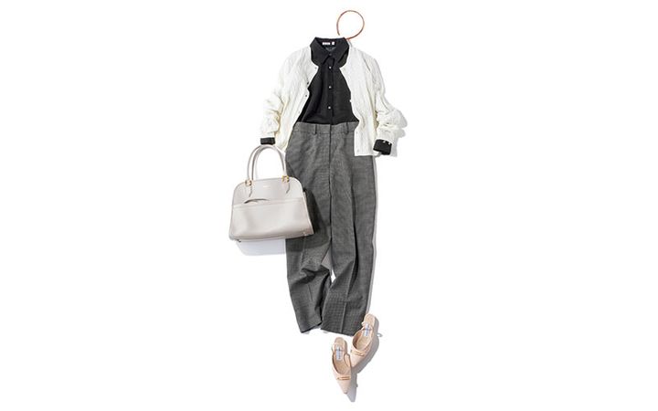 必需品のアンサンブル、今季はケーブルがおすすめ。肩掛けもサマになる!カーディガン¥3,990ニット¥2,990(ともにUNIQLO)