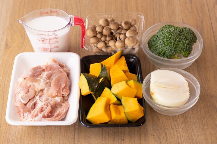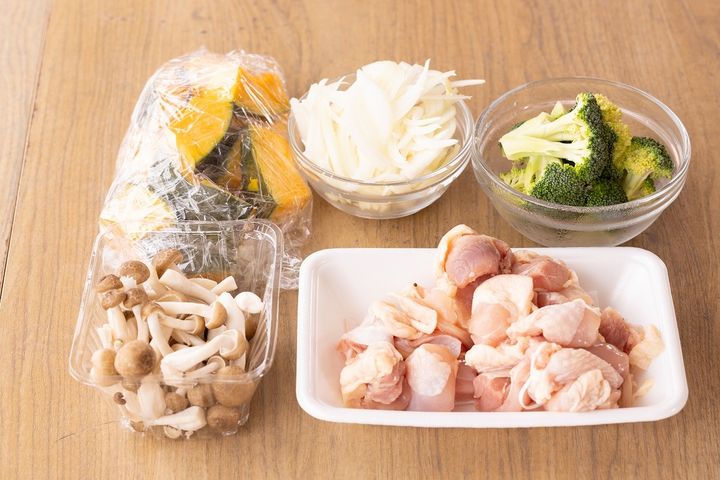 1. かぼちゃは一口大に切り、ラップに包んで600Wの電子レンジで5分加熱する。ブロッコリーは小房に切り、玉ねぎは薄切りにする。しめじは石づきを取りばらす。鶏肉は一口大に切る。