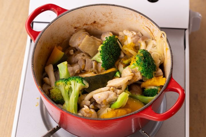 2. 鍋でオリーブオイルを中火で熱し、鶏肉、玉ねぎを加え塩、こしょうをして炒める。鶏肉に焼き色が付いたら、かぼちゃ、しめじ、ブロッコリーを加え2~3分炒める。