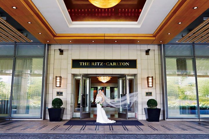 世界屈指のラグジュアリーホテルブランドとして、多くの人々に愛される「ザ・リッツ・カールトン東京」。当日はゲストとの時間を大切に過ごせるように、館内での「プレシューティング」も可能。ホテル名が輝く正面エントランスは花嫁の定番!