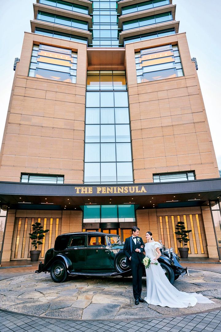 皇居外苑や日比谷公園の自然を望む「ザ・ペニンシュラ東京」。“ロールス・ロイス・ファントムⅡ”でのドライブや祝福に包まれるロビーウォークなど、この会場ならではの演出が素敵なシャッターチャンスに! ホテルをバックに感動の瞬間を閉じ込めて。
