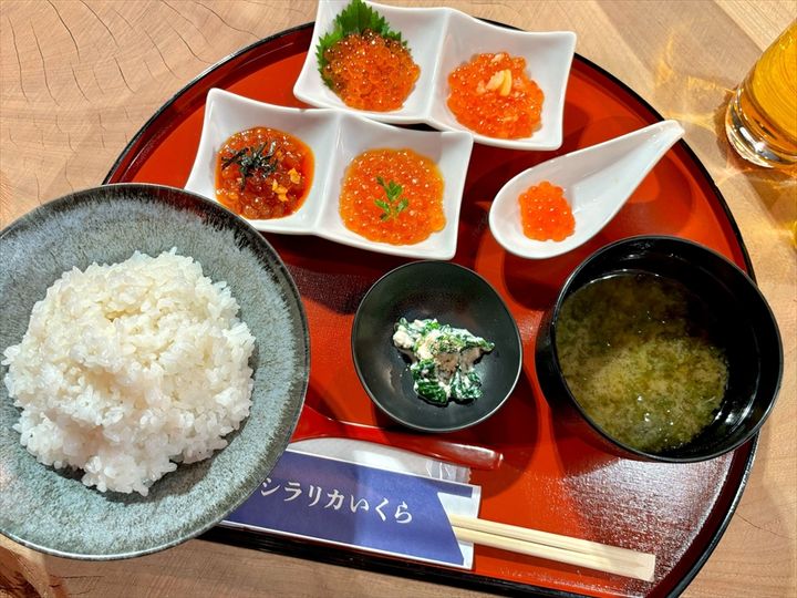 会場内で食べられる「シラリカいくら食べ比べセット(税込1,600円/5種のいくら・白米・小鉢・汁物付き)」を実食!