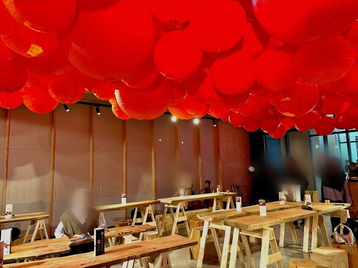いくらを模した大小様々なちょうちんが、天井を色鮮やかに彩ります。木の温かなぬくもりを感じられるテーブルとイスもたくさん用意されているので、家族連れなど複数人でも安心。