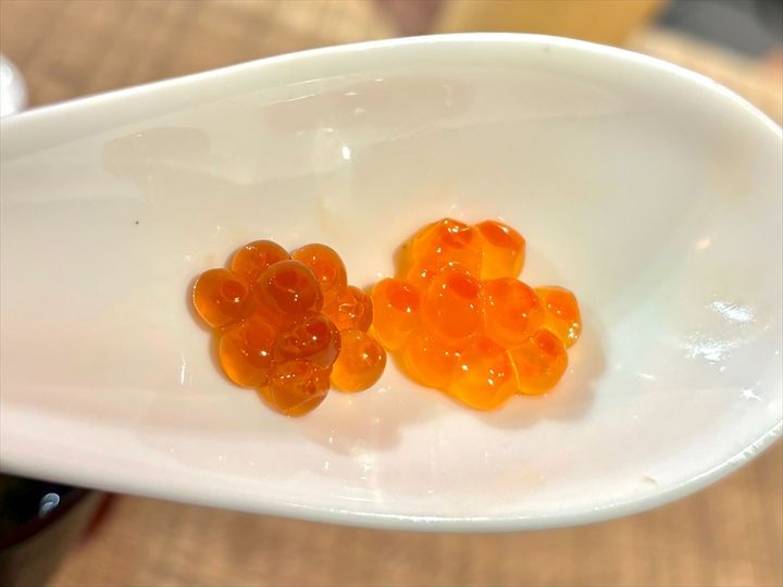 比べてみるとまず、色の違いが真っ先に目につきます。シラリカいくらは明るいオレンジ色をしていて、どちらも同じいくらの醤油漬けなのに、こうも違うのか……と思わず唸ってしまいました。