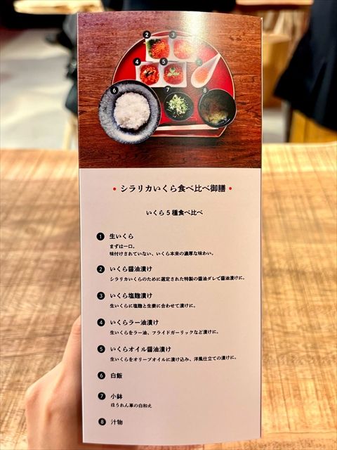 こちらの案内の数字通りに食べるのがおすすめなんだそう。1番目は生いくらから! 詳しく解説していきます。