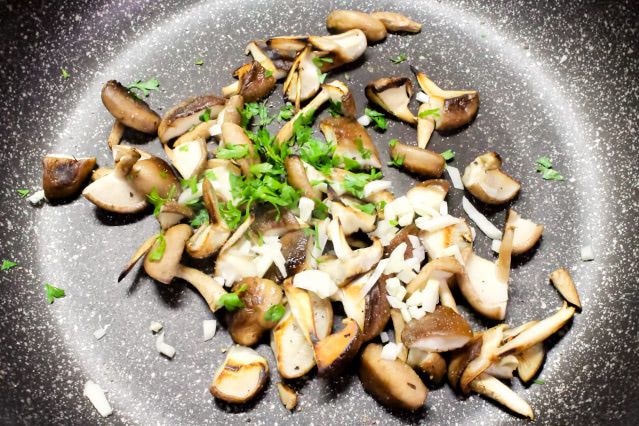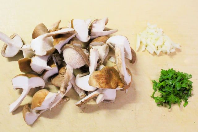 1. しいたけは軸の先端だけ切り落とし、軸ごと4等分にカット。にんにくとパセリは、みじん切りにします。