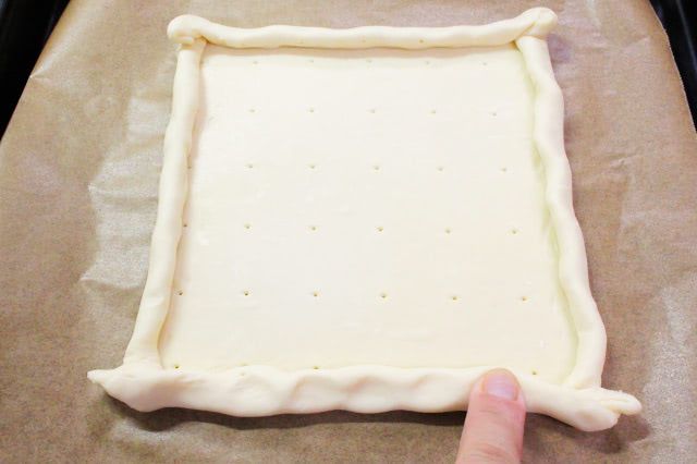 冷凍パイシートはすぐに解凍出来るので、作り始めるタイミングで冷凍庫から出すと、扱いやすいと思います。焼いた時に厚みが出るようにパイ生地の周囲を折り、指で押して密着させます。