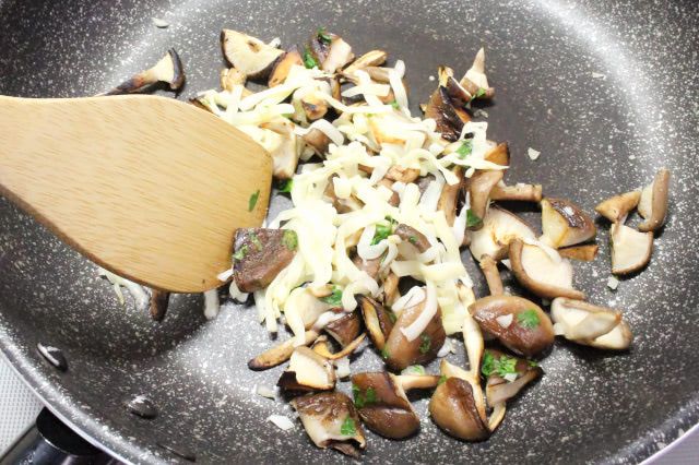 チーズは余熱でとかすのがポイントです。チーズがとけると、しいたけにねっとりと絡まりました。