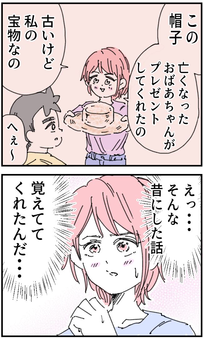 そう言われたかおりさんは「この帽子、亡くなったおばあちゃんがプレゼントしてくれたの。古いけど私の宝物なの」以前、いちろうさんに話したことを思い出し、「えっ・・そんな昔にした話、覚えててくれたんだ・・」と思いました。