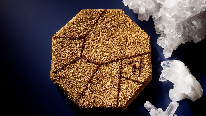 青山ブティック限定で販売される「ガレット ノワゼット エ ジャンドゥジャ」は、フレーバーのラビリンス(迷宮)といわれる名品。サクサクとしたパートフィユテ(折り込みパイ生地)の食感と、カリカリとした焙煎ナッツが際立つヘーゼルナッツクリーム、ジャンドゥジャ、ヘーゼルナッツのプラリネの風味を楽しめます。鉱物の結晶をイメージした遊び心いっぱいの斬新なデザインにも注目です。