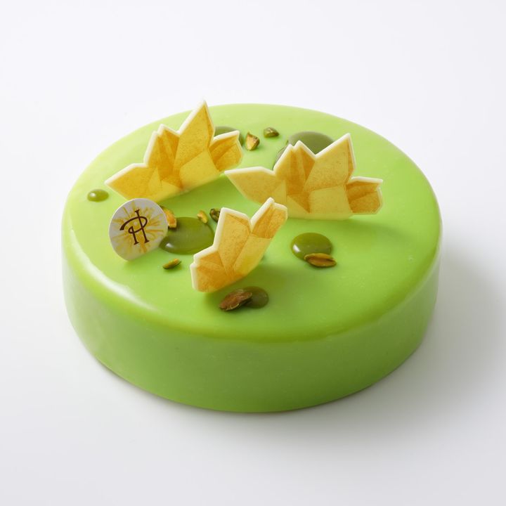 ピエール・エルメの神技が光る、ピスタチオの持つあらゆる魅力がぎっしりと詰まった逸品。中には、ピスタチオ風味サブレやピスタチオのプラリネ、ピスタチオ風味クリーム、ピスタチオ風味ビスキュイが入っており、オレンジフラワー風味マスカルポーネクリームがアクセントになっています。トップに鉱物のモチーフが飾られた、独創的なデザインも話題を呼んでいます。