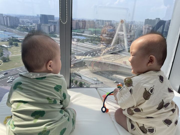 景色を見ながら楽しそうに話をしているように見える双子の赤ちゃん。まだお話はできない月齢かなと思いますが、赤ちゃん同士で楽しく話をしていそうな、和気あいあいとした雰囲気を感じますよね。