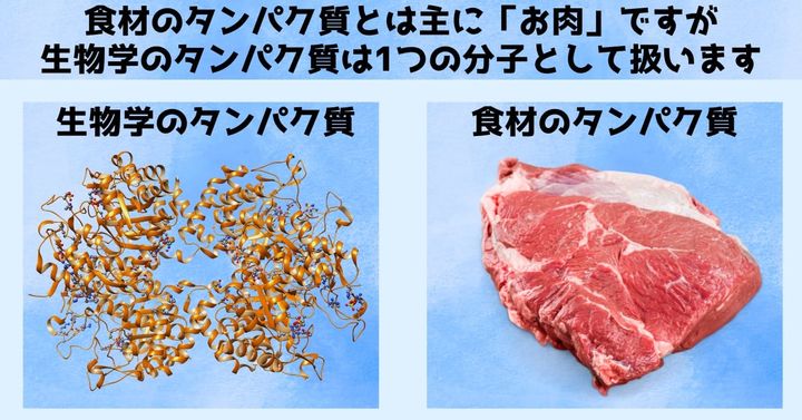生物学では食材と違い、赤血球にある酸素を運搬する役割を持ったタンパク質や感染から守ってくれる抗体タンパク質、DNAを複製するコピータンパク質など、1種類ごとの分子レベルのタンパク質に焦点を合わせています。