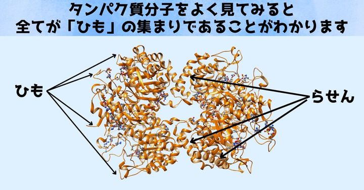 しかしよく目をこらすと、タンパク質分子のあらゆる部分がひも状をしていることに気付くと思います。