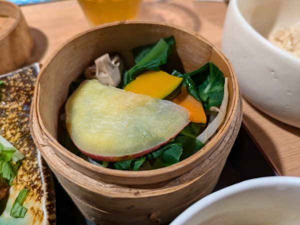 厳選した野菜をたっぷり、ビタミンをふんだんに摂取できる蒸篭蒸し野菜!バーニャカウダソースには、亜麻仁油とEPAを豊富に含んだ鯖が使われているそうです。