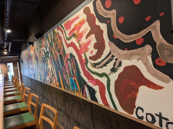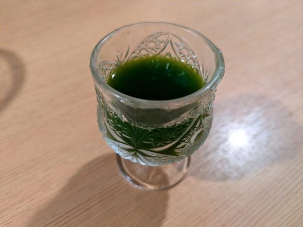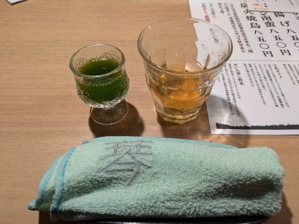 カウンターに座るとしばらくして、青汁のような野菜ジュースが出て来ました。おしぼりには「琴」の文字。「鳥琴」だからでしょうか。