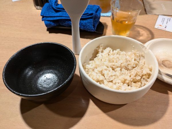 兵庫県和田山産の農家直送、炊き立てコシヒカリと玄米を3割だけ精米した栄養豊富な七分づきの胚芽米を使用したご飯。そのまま食べてもよし、卵かけごはんにしてもよし。るなるなは両方しちゃいました。おいしかったぁ。焼き鳥屋さんの健康へのこだわりを徹底したランチでした。