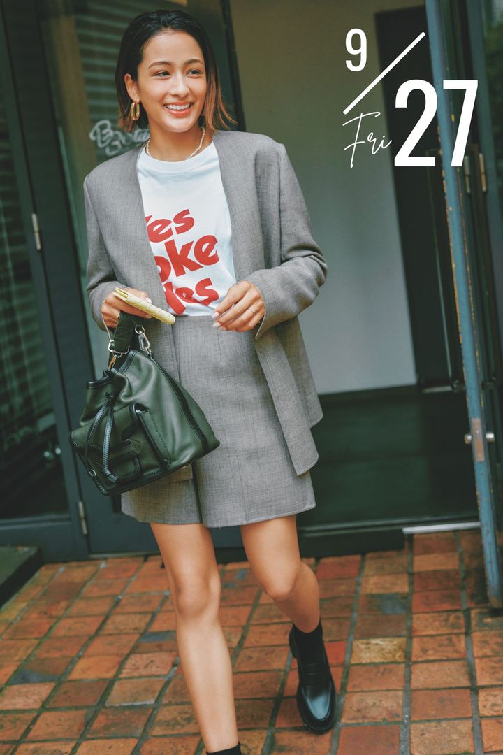 ジャケット¥83,600ショートパンツ¥41,800(ともにベイジ,/オンワード樫山 お客様相談室)Tシャツ¥7,480(GOOD ROCK SPEED/フレームワーク ルミネ新宿店)ピアス¥13,200(ワンエーアールバイウノアエレ/ウノアエレ ジャパン)ネックレス¥6,930(アビステ)ダブルリング¥41,800(リューク)バッグ¥193,600(ピエール アルディ/ピエール アルディ 東京)ローファー¥151,800(J.M. WESTON/J.M. WEST ON 青山店)ソックス/スタイリスト私物、名刺入れ/本人私物