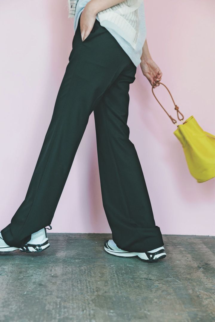 キレイめにもカジュアルにもはける「黒パンツ」はやっぱり最強!この秋は、シルエットをフレアに変えるだけで鮮度アップ。スニーカー合わせでも脚長効果が狙えます。