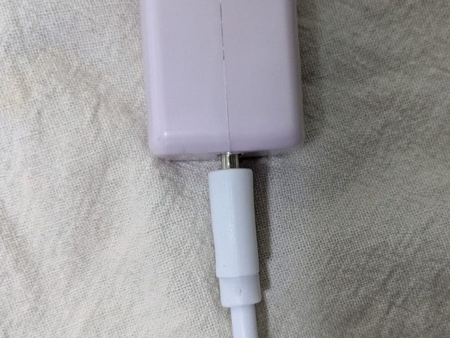 付属のUSBケーブルのプラグを本体のUSBポートに差し込み、もう一方のプラグはACアダプタのUSBポートに差し込むことで使用できます。ACアダプタは付録には付いていないので注意してくださいね!5V/2.0A以上のACアダプタが必要となりますよ!