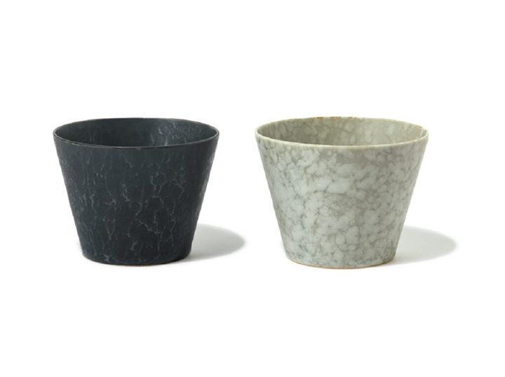 職人の丁寧な手仕事による有田焼のそばちょこ。右はエンケラドゥスの地表の氷の割れ目に沿って噴出している水蒸気と氷粒子からなる間欠泉を、左は漆黒の宇宙に漂う時間を釉薬で表現。各¥2,200(BARBAR/MoMAデザインストア 表参道 TEL:03・5468・5801)